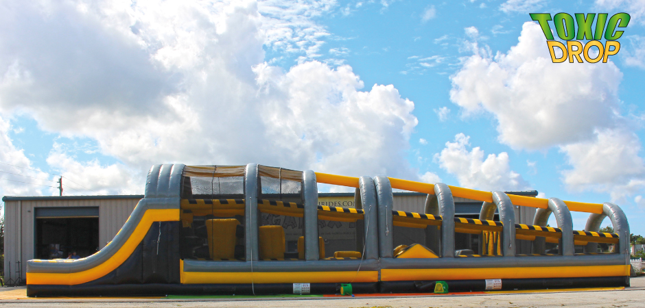 Toxic Drop is our new inflatable obstacle course with a twist. It is a two player game where the players are challenged by a series of different obstacles. As they progress to the second section, they get higher & higher by climbing up the blocks. When they get to the last block it is in the shape of a giant wedge (narrower at the bottom) thus causing it to sway back and forth. The players have to balance themselves so they don’t fall down The Drop. If they do they can exit out the side and try again. The games has 7 of obstacles: Obstacle 1. The Wedges Obstacle 2. The X Wall Obstacle 3. The Vault Obstacle 4. The Mangle Obstacle 5. The Blocks Obstacle 6. The Drop Obstacle 7. The Slide